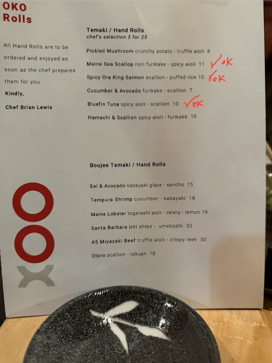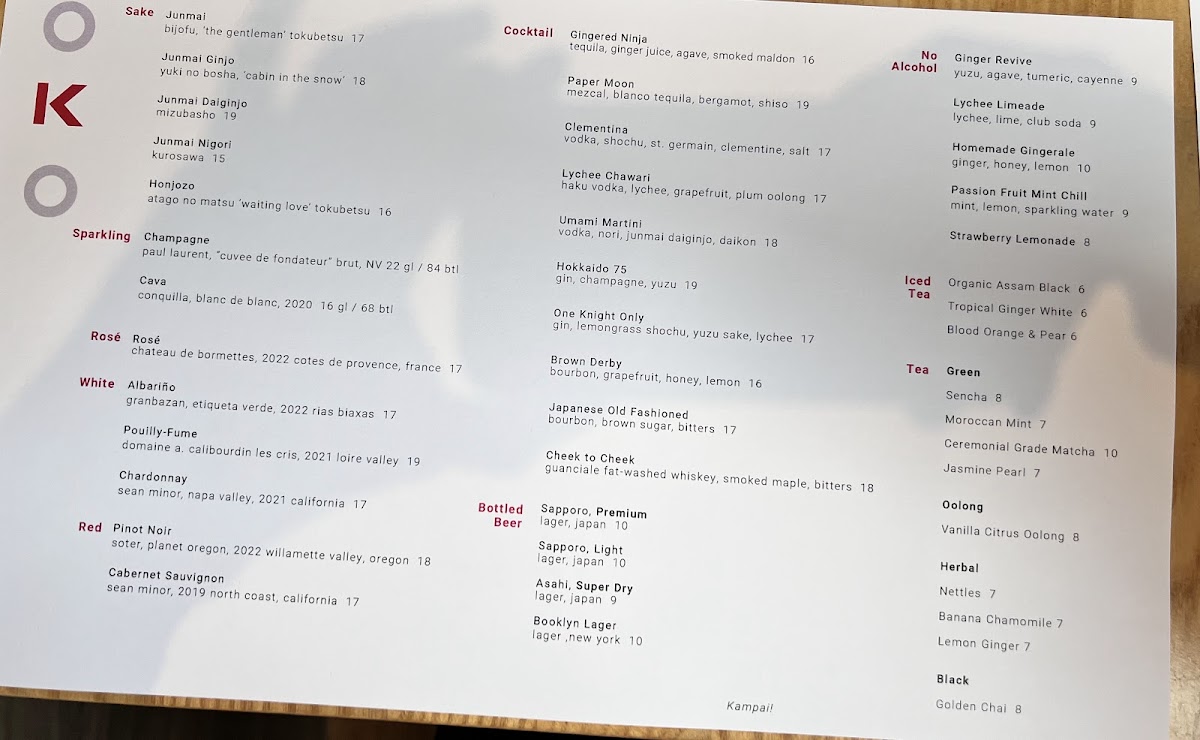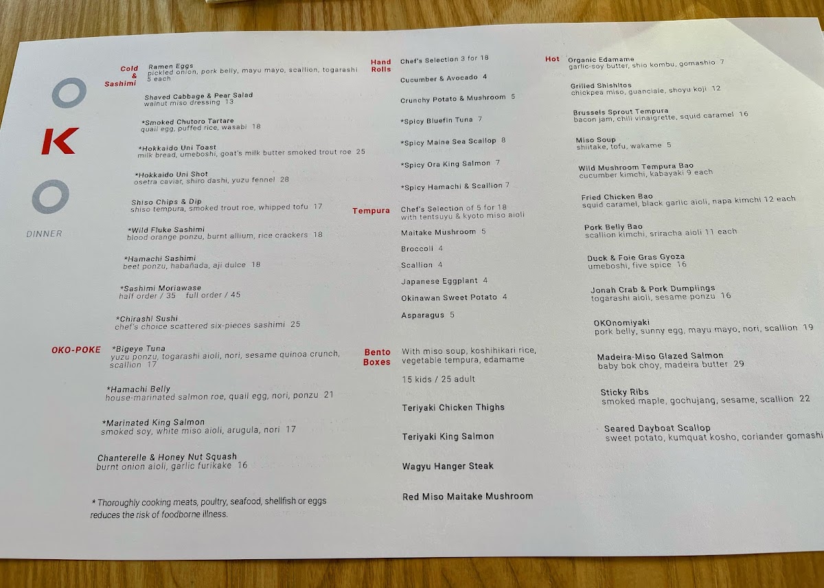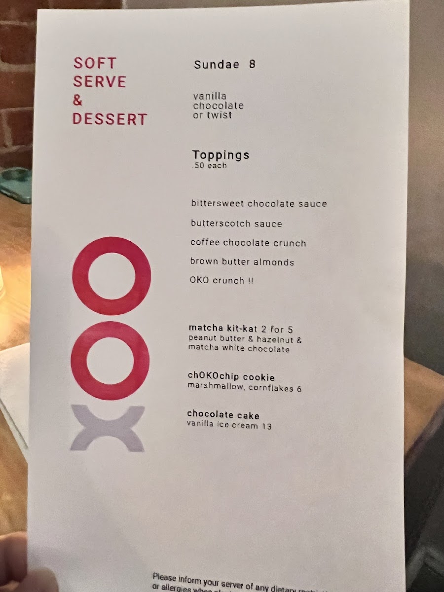 Vegetable-forward dishes are equally compelling, especially in the tempura section, where Shiitake Mushroom Tempura, Japanese Eggplant Tempura, Okinawan Sweet Potato Tempura, Koginut Squash Tempura, and the Tempura Selection | 5 Pieces showcase light, crisp textures without overwhelming the natural flavors. The OKO-Poke options-King Salmon Poke and Bigeye Tuna Poke-offer a fresh, modern contrast, ideal for guests seeking something vibrant yet satisfying. Hot dishes round out the menu with comforting and robust choices such as Robata Chefs Selection, Chicken Robata, Hanger Steak Robata, Fried Chicken Bao Bun, and Miso Soup, adding warmth and depth to the overall progression of the meal. Finally, dessert brings a playful, approachable finish with ChOKOchip Cookie, Sundae, and Matcha Kit Kat, leaving diners with a memorable sweet note. Altogether, the menu at Oko Rye feels cohesive and well-balanced, making it a fitting conclusion to a dining experience that emphasizes quality ingredients, careful technique, and a clear respect for Japanese culinary traditions.